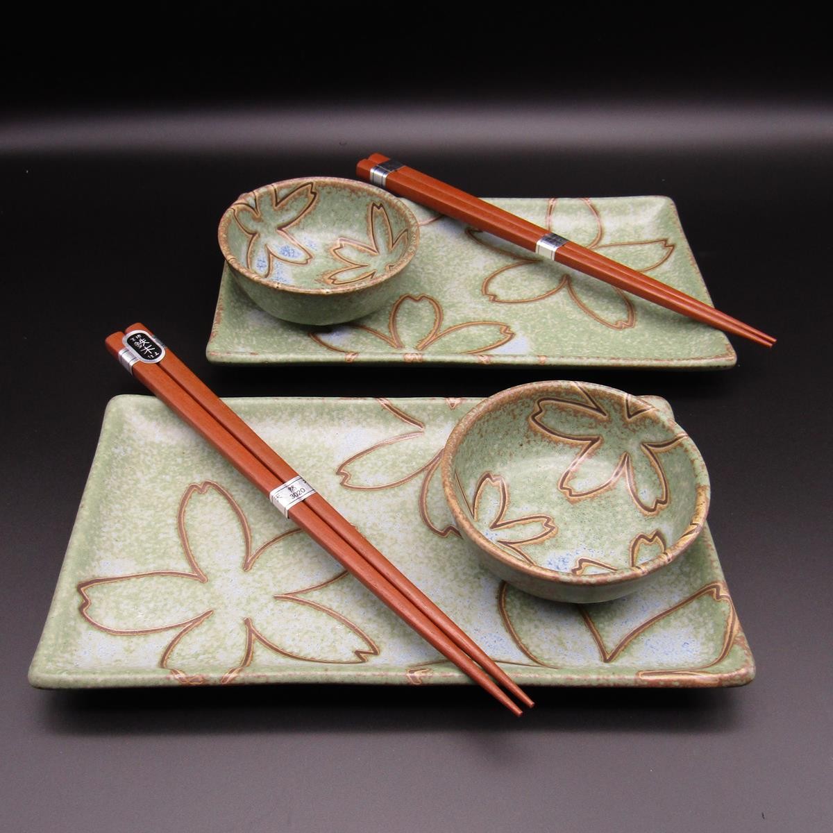 Delicato set da sushi in ceramica giapponese di colore verde, non smaltata e con fiori stilizzati su tutta la superficie, composto da 2 piatti, 2 ciotoline per la salsa di soia e 2 paia di hashi (bacchette).